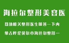 海拉爾整形美容網(wǎng)是經(jīng)典網(wǎng)旗下內(nèi)蒙古區(qū)域?qū)I(yè)提供整形美容咨詢,手術(shù)預(yù)約,整形醫(yī)院,整形專家查詢,作為內(nèi)蒙古地區(qū)最專業(yè)最好整形醫(yī)院加盟以加強區(qū)域化務(wù)服,為愛美朋友提供快捷,便利的整形通道,為您提供海拉爾整形,海拉爾整形醫(yī)院,海拉爾最好整形醫(yī)院,海拉爾最好整形專家,海拉爾整形價格,海拉爾隆胸,海拉爾假體隆胸,海拉爾隆鼻,海拉爾雙眼皮,海拉爾改臉型,海拉爾吸脂減肥,海拉爾瘦臉,海拉爾除皺拉皮,海拉爾下頜角整形,海拉爾彩光嫩膚,海拉爾牙齒矯正,海拉爾開眼角,海拉爾祛眼袋,海拉爾磨顴骨等咨詢